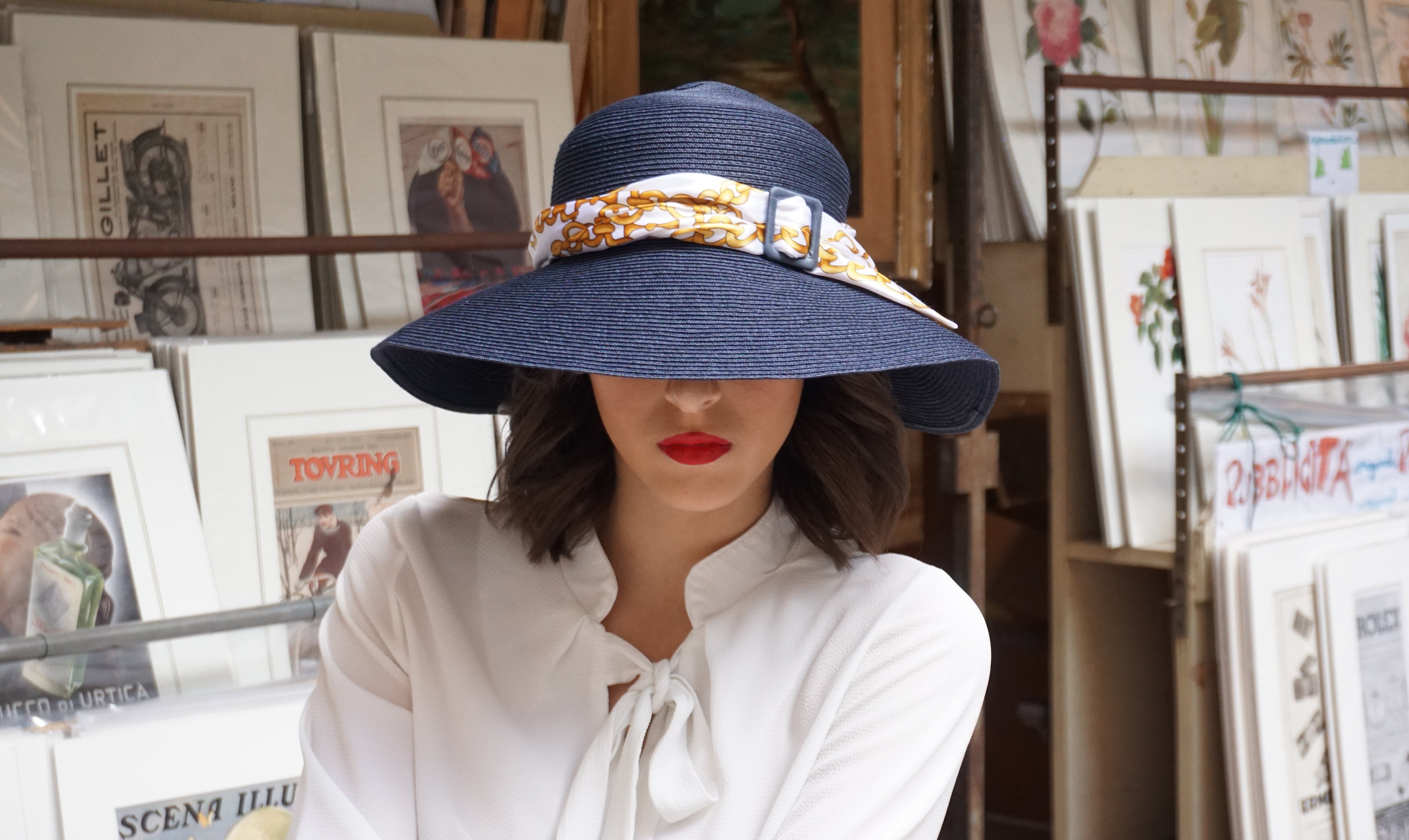 Per la stagione del sole, abbiamo scelto un materiale insolito, le fibre di carta intrecciata, leggere ma strutturate, che mantengono la forma con grazia, e da questo 'tessuto' è nato Sophie, un cappello dalle linee raffinate e romantiche. La tesa morbida e ampia protegge dal sole con eleganza, mentre il foulard annodato con motivo a catene dorate e fibbia vintage aggiunge un tocco deciso ma sofisticato.